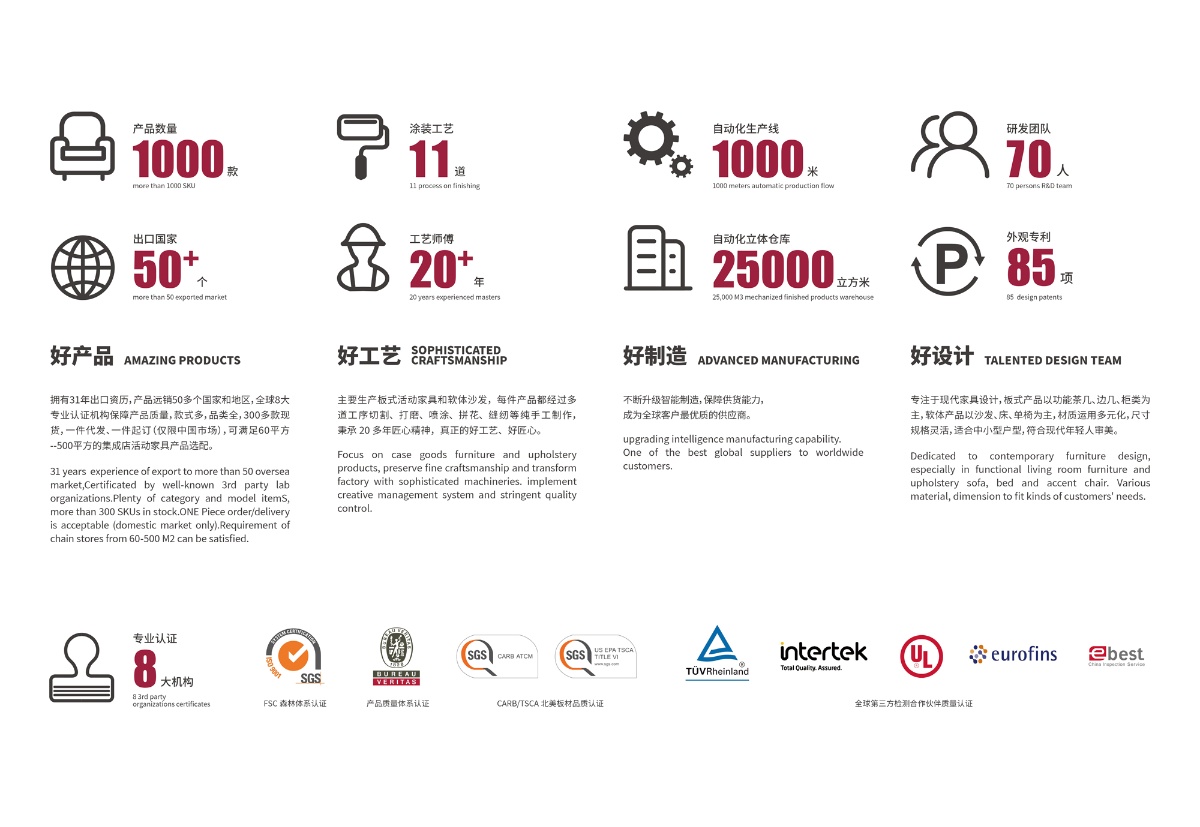 企業(yè)以產(chǎn)品為載體創(chuàng)造出產(chǎn)品本身的價(jià)值點(diǎn),設(shè)計(jì)出時(shí)尚、北歐現(xiàn)代的家居風(fēng)格,以高質(zhì)量、高性?xún)r(jià)的工藝打造產(chǎn)品營(yíng)銷(xiāo)市場(chǎng)遍布全球,為上百個(gè)知名品牌提供代加工服務(wù),“客戶(hù)導(dǎo)向,專(zhuān)注專(zhuān)業(yè)”是企業(yè)的營(yíng)銷(xiāo)理念,由服務(wù)與產(chǎn)品成就未來(lái),為您品牌增添優(yōu)勢(shì),創(chuàng)造價(jià)值。主要生產(chǎn)板木家具與沙發(fā)類(lèi)軟體家具,板木類(lèi)家具已實(shí)現(xiàn)60%的自動(dòng)化,40%來(lái)自于手工制作企業(yè)經(jīng)歷了兩代人的發(fā)展,一直致力于創(chuàng)造奏啟發(fā)性的家居設(shè)計(jì)。