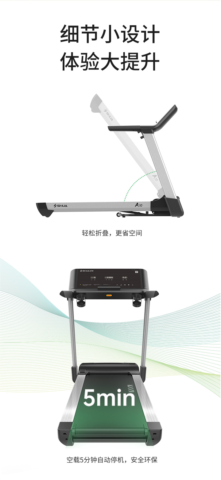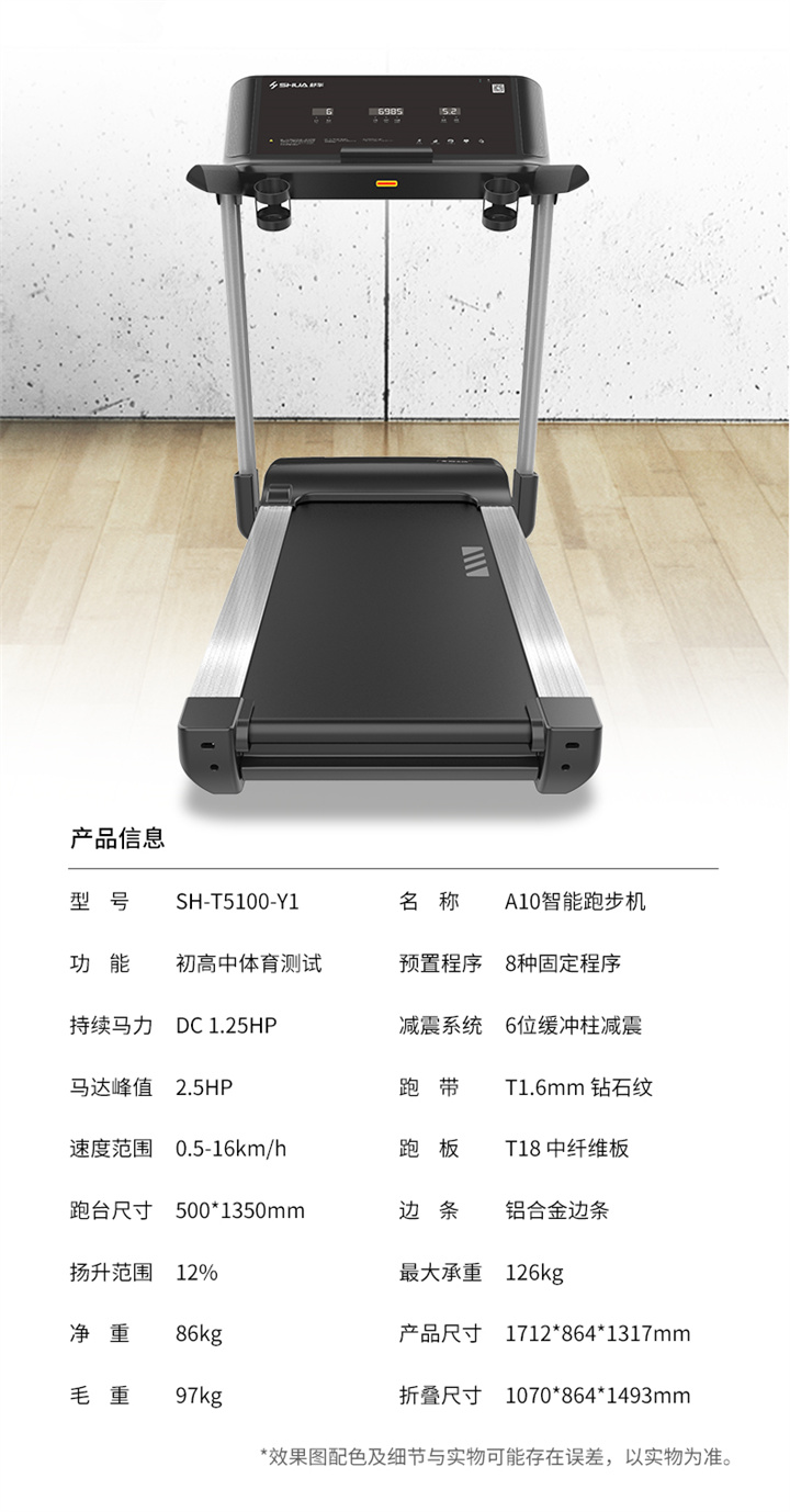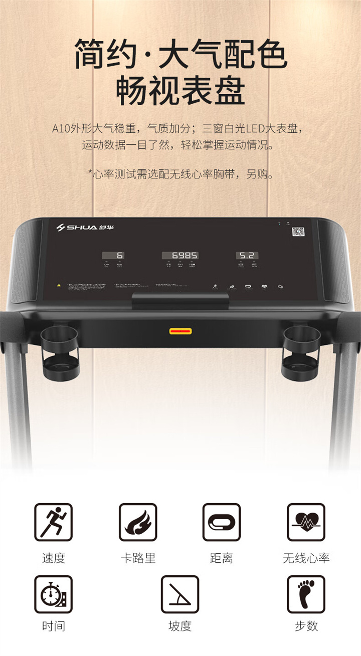 舒華家用跑步機(jī)SH-T5100持續(xù)馬力達(dá)1.25HP,具有500×1350mm的跑臺,運(yùn)用無線心率接收模塊監(jiān)測心率,運(yùn)用6位硅膠減震設(shè)計(jì),最大承重是126kg,可以滿足大多數(shù)家庭的使用。