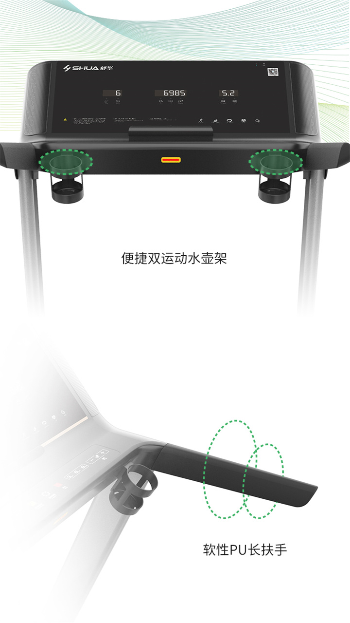 舒華跑步機(jī)SH-T5500采用T18mm的跑板,T1.6 鉆石紋的跑帶,運(yùn)用6位硅膠減震,對您跑步中的膝蓋進(jìn)行全方位的呵護(hù),選用手握心率測試,跑步面積達(dá)480×1350mm,可承受126kg的使用者使用。