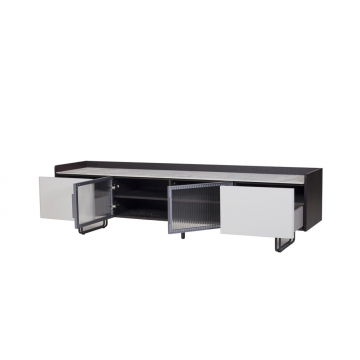 卡塔金巖板面板+煙熏木皮主體+淺駝色啞光抽面板+長虹玻璃+紳士灰門框+金屬深灰色金工腳