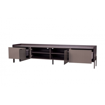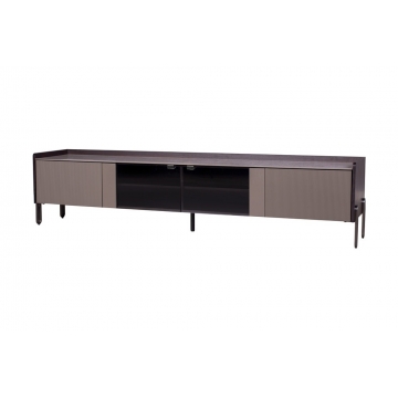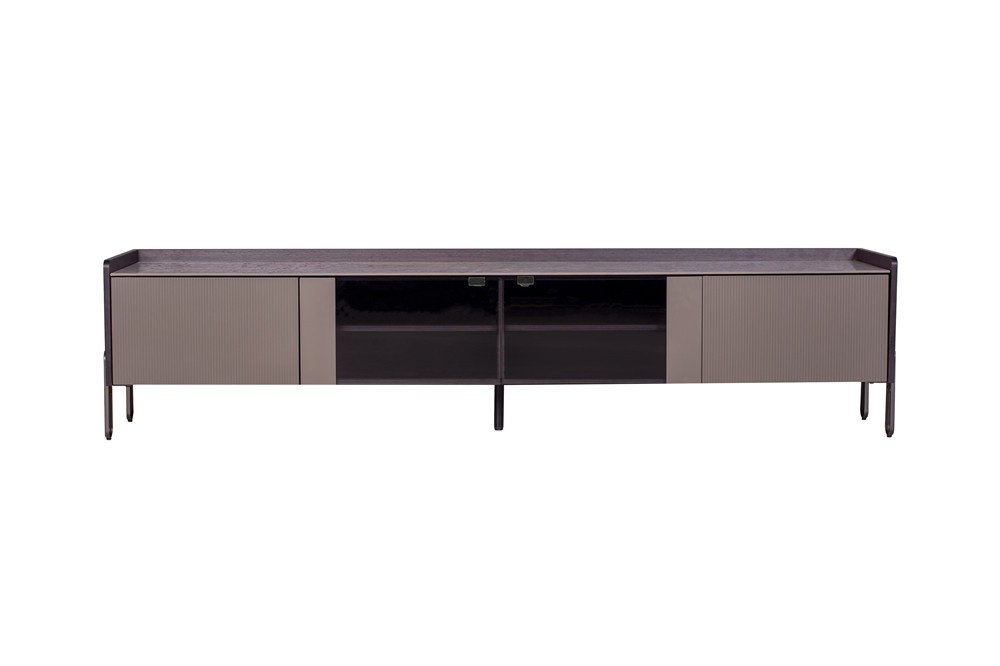 普佩石巖板面板+煙熏木皮主體+石色啞光門板 +透明鋼化玻璃柜門+拉絲灰金金工腳